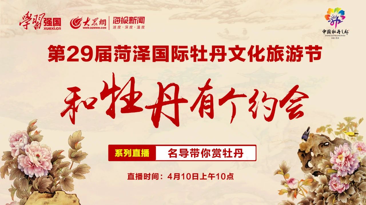 4月10日,“学习强国”学习平台“直播中国”将走进山东菏泽,让我们一起跟随镜头观看第29届菏泽国际牡丹文化旅游节开幕式、线上游园赏菏泽牡丹,“云”看2020世界牡丹大会。敬请收看!